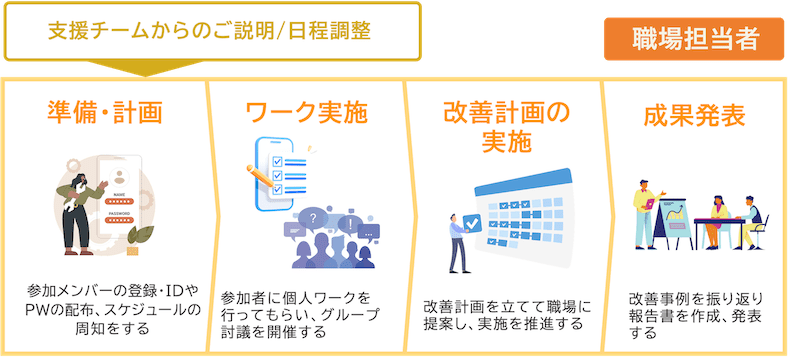 事業場担当者とは、事業場の窓口として全体の企画推進を行う方のことです。主な役割は以下の内容になります。